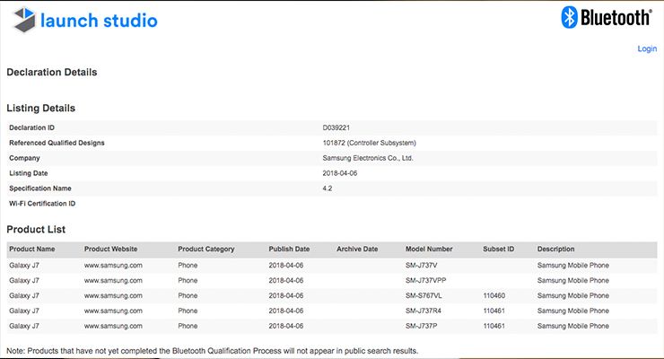 Na publicação onde é apresentada a sua certificação Bluetooth, o novo Samsung Galaxy J7 (2018) aparece em 5 variantes diferentes. No entanto, não significa que irá chegar em 5 modelos diferentes, podendo apenas ser devido aos modelos variarem conforme os mercados a que se destinam.