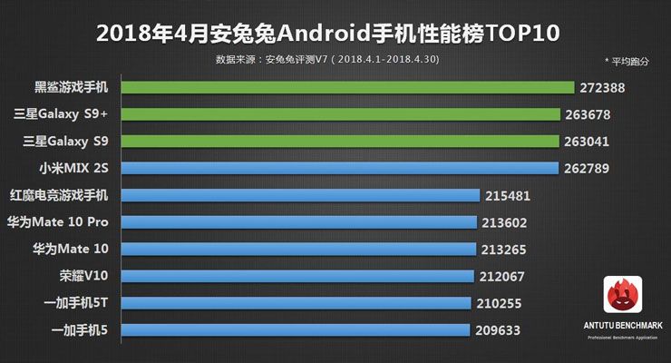 Os restantes lugares do pódio são ocupados pelos actuais topo de gama da Samsung, o Galaxy S9+ e Galaxy S9 respectivamente. Ambos os smartphones apresentam o processador SD845 e alcançaram as pontuações de 263,678 (GS9+) e 263,041 (GS9).