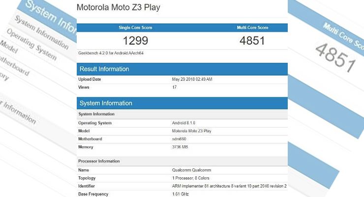 De acordo com a listagem no GeekBench, o Motorola Moto Z3 Play vai chegar equipado com o processador Qualcomm Snapdragon 660 SoC, apoiado por 4GB de memória RAM. No que respeita ao seu software, tal como seria de esperar o novo smartphone irá chegar de fábrica com o Android 8.1 Oreo. Infelizmente, estas foram as únicas informações reveladas pelo mais recente teste de performance.