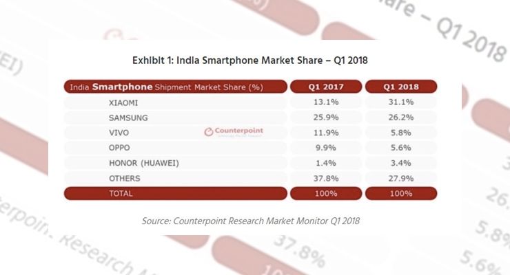 De acordo com a Canalys a Índia é o mercado mais atractivo do momento, tendo mesmo ultrapassado os Estados Unidos no terceiro trimestre de 2017, tornando-se assim no segundo maior mercado no que respeita à venda de smartphones, logo depois da China. A Xiaomi conseguiu conquistar o primeiro lugar no mercado indiano com uma quota de mercado de 31,1% no primeiro trimestre de 2018, enquanto que a OPPO ocupa a 4ª posição com apenas 5,8%.
