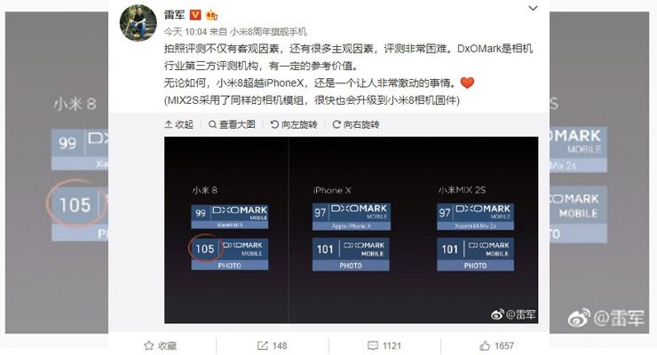 Com a evolução das câmaras nos smartphones e a sua importância para os utilizadores, empresas como o a DxOMark acabaram por ganhar também muito mais importância, surgindo como um factor independente de comparação entre os vários smartphones disponíveis no mercado.Hoje Lei Jun utilizou mais uma vez a sua conta oficial na Weibo para trazer excelentes novidades aos fãs da Xiaomi, relembrando que o seu anterior topo de gama – Mi Mix 2S – foi lançado com capacidades fotográficas idênticas ao iPhone X, o melhor topo de gama da Apple. Mas as novidades são que o Xiaomi Mi Mix 2S irá em breve colocar-se ao mesmo nível do recém lançado topo de gama da gigante chinesa.