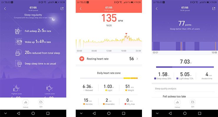 Mais uma vez, na monitorização da qualidade do teu sono a sua precisão é bastante subjectiva. No entanto, através do controlo do acelerómetro e sensor de batimentos cardíacos a Mi Band 3 apresenta-te dados básicos sobre o teu sono. Classificando-o em “sono leve”, “sono pesado” e “acordado”, oferecendo também algumas informações estimadas sobre a hora a que foste para a cama e a hora a que te levantas-te.