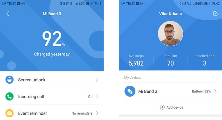 - Estatísticas: esta é a secção dedicada ao fitness e actividades físicas, onde vais poder ter acesso aos dados diários sobre passos, calorias queimadas e distância percorrida. No final deste menú podes também ver o nível de bateria da tua Xiaomi Mi Band 3.