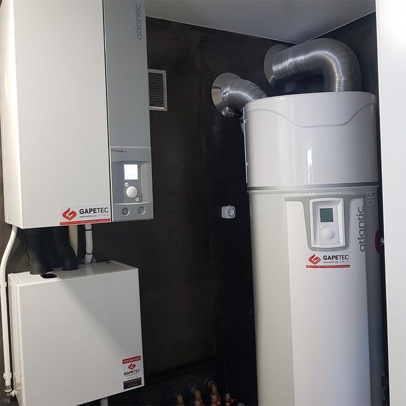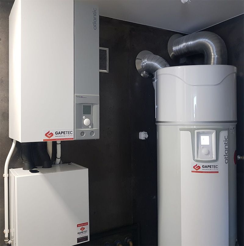 E essa solução baseou-se precisamente em sistemas aerotérmicos Atlantic – Bomba de Calor AQS EXPLORER SOLAR 270 e a bomba de Calor ALFEA EXCELLIA AI 11T – pela simplicidade de instalação, eficiência e conforto. Por sua vez recuperamos o ar quente e vapores dos w.c.´s para um melhor rendimento da Bomba de Calor AQS EXPLORER SOLAR 270 e ao mesmo tempo fazemos a retirada dos vapores dos w.c.´s permitindo renovação de ar. Na bomba de Calor ALFEA EXCELLIA AI 11T acoplamos um Kit 2 Zonas Split para usufruir do aquecimento para piso radiante e ventiloconvectores. Todo o sistema com controlo via Wi-fi.