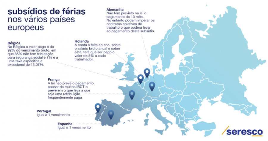 Em Portugal a lei de trabalho estabelece a prática de pagamento do chamado 13º mês ou subsídio de férias. Somos, juntamente com Espanha, e de acordo com a empresa de processamento salarial, Seresco, um dos poucos países onde está instituído o pagamento de subsídio de férias equivalente a um vencimento, e excluindo deste o subsídio de almoço. A Seresco divulgou as práticas em cinco países europeus.
