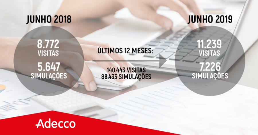 A Adecco Portugal divulgou os dados do último ano do simulador de vencimento liquido para trabalhadores temporários, lançado em 2017, disponível em adecco.pt. Nos últimos 12 meses compreendidos entre junho de 2018 e junho de 2019, diz a marca que foram feitas 88.433 simulações. As visitas a este site somaram as 140.400 visitas com uma média mensal registada de cerca de 9.000 visitas e 5.500 simulações em 2018 vs cerca de 11.300 visitas e 7.200 simulações em 2019.