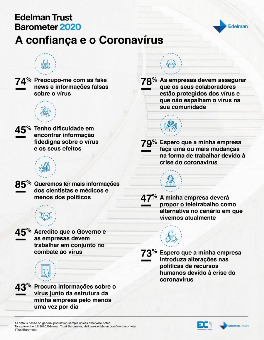 A EDC quer nesta altura de maiores desafios partilhar o relatório exclusivo da Edelman, para dar uma melhor perspetiva do cenário em que vivemos. Este relatório nasce de um estudo levado a cabo em 10 países entre os dias 6 e 10 de março – Brasil, Canadá, França, Alemanha, Itália, Japão, África do Sul, Coreia do Sul, Reino Unido e Estados Unidos da América. Entre as principais conclusões do estudo, destaque para: