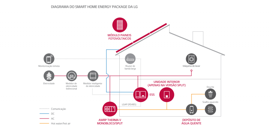 Foi assim que nasceu o inovador Smart Home Energy Package da LG, o primeiro pacote de energia integrado do mundo, que inclui todos os equipamentos necessários para produzir energia renovável e sustentável em casa, no escritório ou em qualquer outro edifício. Contando com módulos fotovoltaicos premiados, um sistema de armazenamento de energia e bomba de calor ar-água, permite não só gerar energia solar como também armazená-la de forma inteligente para usar quando for necessário.