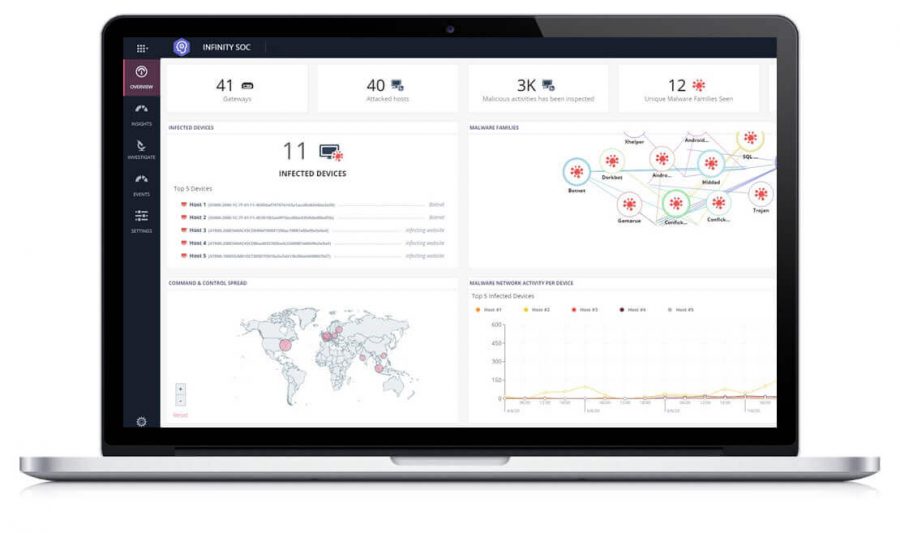 ● Precisão sem precedentes para eliminar ataques reais: automaticamente expõe até os mais elaborados ataques entre milhões de logs diários e alertas com uma precisão sem precedentes, suportada por tecnologia de análise de incidentes de Inteligência Artificial líder de mercado. O Infinity SOC automaticamente faz a triagem de alertas para poder responder mais rapidamente a ataques críticos e oferece remediação imediata através de um cliente simples no equipamento infetado. Também previne os hackers de poderem lançar campanhas de phishing contra os utilizadores ao colocarem em baixo websites e emails semelhantes aos dos domínios do cliente.