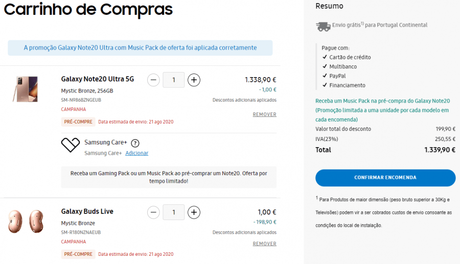 A compra feita através do site oficial incluí uma de duas ofertas: Samsung Galaxy Buds Live ou um Pack Gaming.