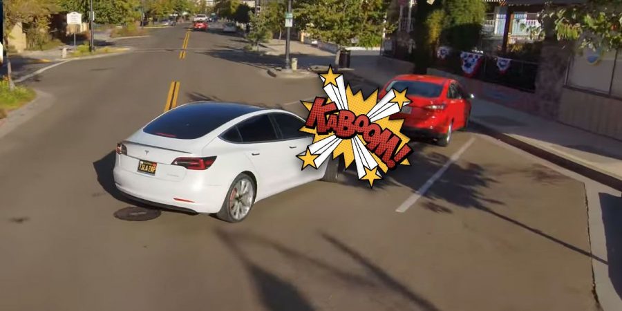 No minuto 1:25, vemos o Tesla parar numa interseção com sinal STOP e a resumir a marcha virando para a esquerda. Mas, quando tudo parecia estar a correr às mil maravilhas, o carro elétrico decidiu seguir a direito quando detetou um carro vermelho que estava estacionado.