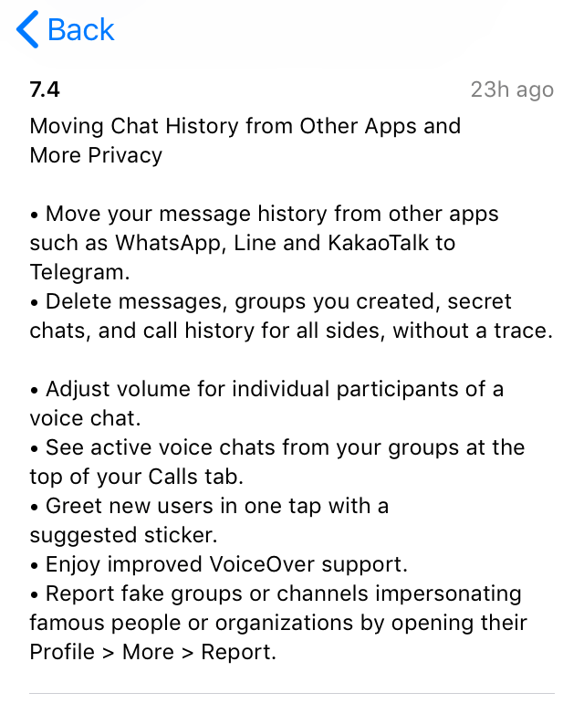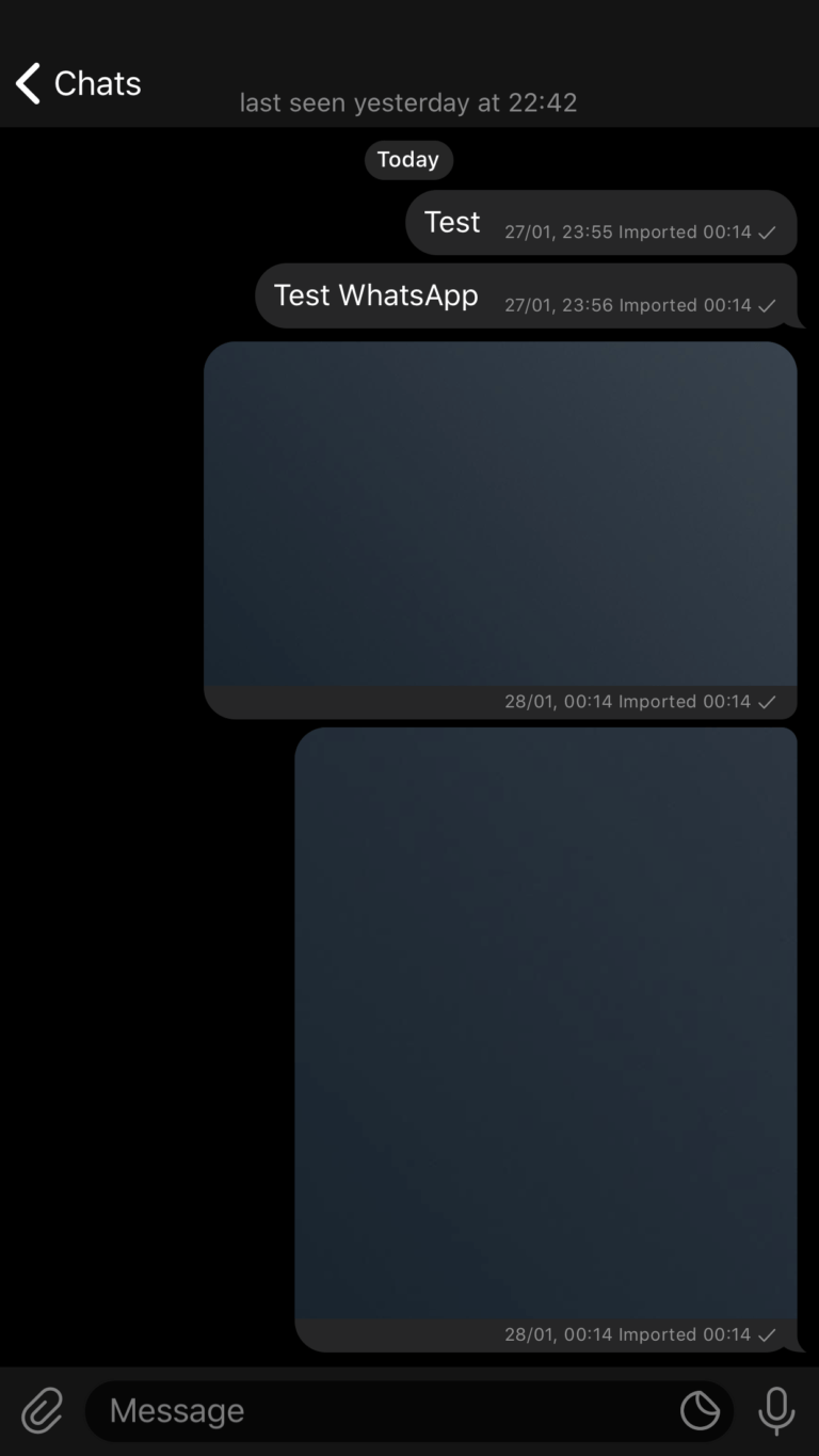 Após este processo, as mensagens provindas da app WhatsApp passarão a estar marcadas no Telegram como “importadas”. A importação de chats de grupo é também possível, utilizando o mesmo processo, sendo ainda possível a escolha entre a importação do histórico de conversa com ou sem ficheiros multimédia.