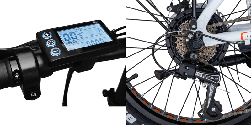 A transmissão da conhecida marca Shimano faz também com que seja confortável adaptá-la a qualquer inclinação e esforço, e o visor LCD permite a qualquer momento ver o estado da bateria e a velocidade a que está a percorrer (atinge uma velocidade máxima de 25 km/h).