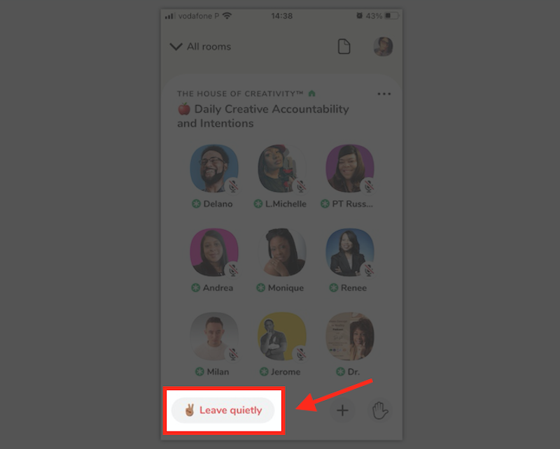 O lado bom do Clubhouse é que, após entrarmos numa sala (seja ela pública ou privada), podemos sair a qualquer momento, sem dar nas vistas, bastando apenas apertar o botão “Leave quitely” (ver imagem abaixo).