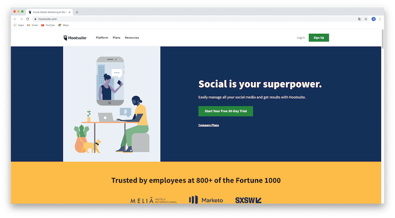 Essa ferramenta tem recursos para gerir as atividades em muitas plataformas, como Facebook, Twitter, LinkedIn e muito mais. É possível experimentar essa ferramenta gratuitamente por 30 dias!
