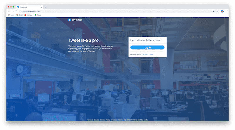 Tweetdeck é uma plataforma online gratuita que melhora o uso do Twitter, permitindo a vinculação da sua conta do Twitter para que possa visualizar todos os fluxos personalizáveis de informações, incluindo tweets, notificações, mensagens, tags e áreas de agendamento.