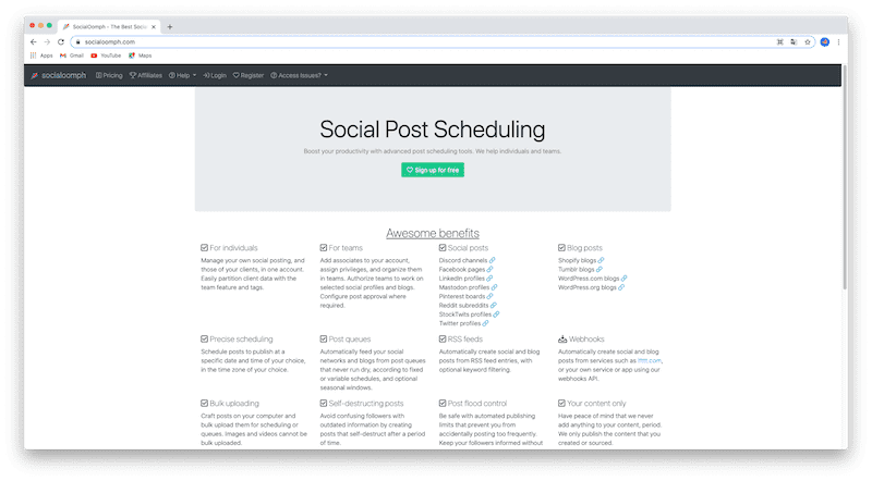 SocialOomph oferece uma ampla gama de recursos para várias plataformas de mídia social, desde recursos típicos, como agendamento e análises de desempenho, até alguns interessantes, como a remoção automática de mensagens desatualizadas da caixa de entrada do Twitter.