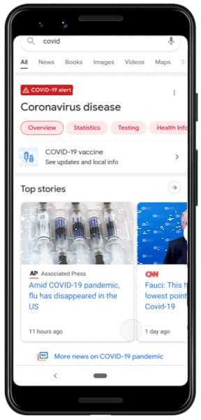 Sempre que um resultado de pesquisa for uma notícia que esteja a ter grande destaque e cobertura a nível dos vários órgãos de comunicação, os utilizadores verão a adição do botão “Cobertura completa” por baixo da notícia.