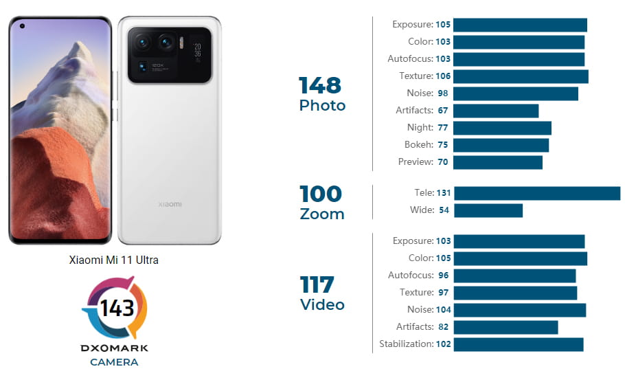 Como seria de esperar, a gigante chinesa não perdeu a oportunidade de recorrer aos testes da reconhecida empresa DxOMark para destacar as capacidades do Xiaomi Mi 11 Ultra. Tal como foi já confirmado por uma publicação feita no site oficial da empresa, o Mi 11 Ultra é o novo Rei da Fotografia, alcançando um resultado final de 143 pontos.