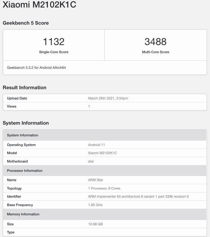 O exemplar em questão é o modelo M2102K1C e vem equipado com 12GB de RAM, tendo obtido 1132 pontos nas provas single-core do Geekbench, enquanto os resultados multi-core se elevam aos 3488 pontos. Estes resultados são mais do que expectáveis e vão de encontro aos que os restantes smartphones Android com Snapdragon 888 têm apresentado, havendo ainda margem para melhorar se esta unidade utilizar software de pré-produção.