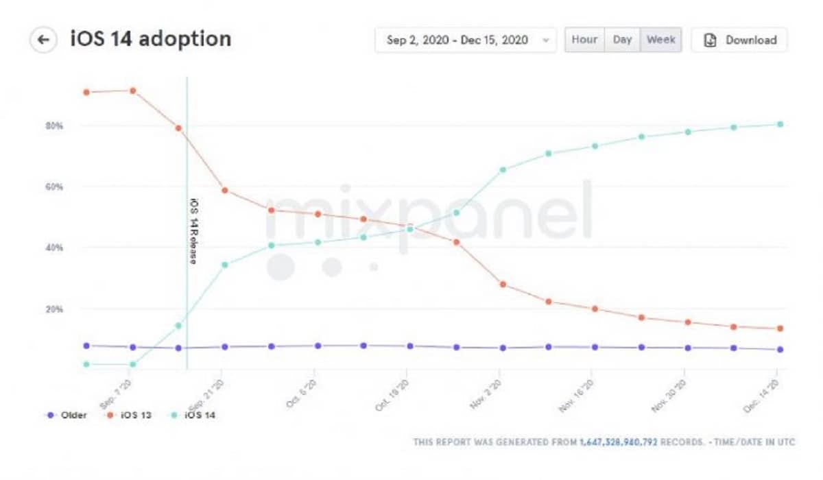 No mês de dezembro de 2020 a taxa de adoção do iOS 14 estava já nuns confortáveis 72%, número que foi crescendo de forma gradual graças a atualizações de segurança e correções de bugs. O primeiro sinal havia sido dado quando na sua primeira semana de vida a nova versão do sistema operativo fazia já parte da vida de mais de 25% dos utilizadores de iPhone e iPad.