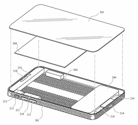 Olhando com atenção à patente, podemos reparar que este design é utilizado não só no painel traseiro do iPhone, mas também na estrutura do dispositivo. Na descrição da patente da Apple podemos ler que: