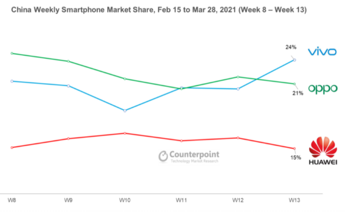 Agora, nem mesmo o mercado chinês consegue suportar a Huawei, sendo dominado pelas suas rivais. De acordo com as mais recentes informações publicadas pela Counterpoint, a Vivo domina o mercado com uma quota de 24%, seguida pela Oppo com 21%. Atualmente, a Huawei continua a sofrer uma quebra acentuada, seguindo na tabela com apenas 15%.