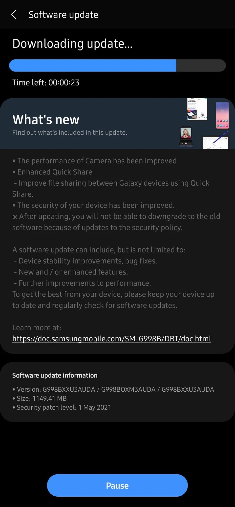A versão de firmware G99XBXXU3AUDA inclui uma série novidades e é impressionante verificar que o patch de segurança de maio acabou de ficar disponível no fim do mês de abril. A Samsung antecipou a atualização de segurança para a gama S21, no entanto, conforme referido atrás, esperamos que em breve seja alargada para os outros modelos e gamas da marca coreana.