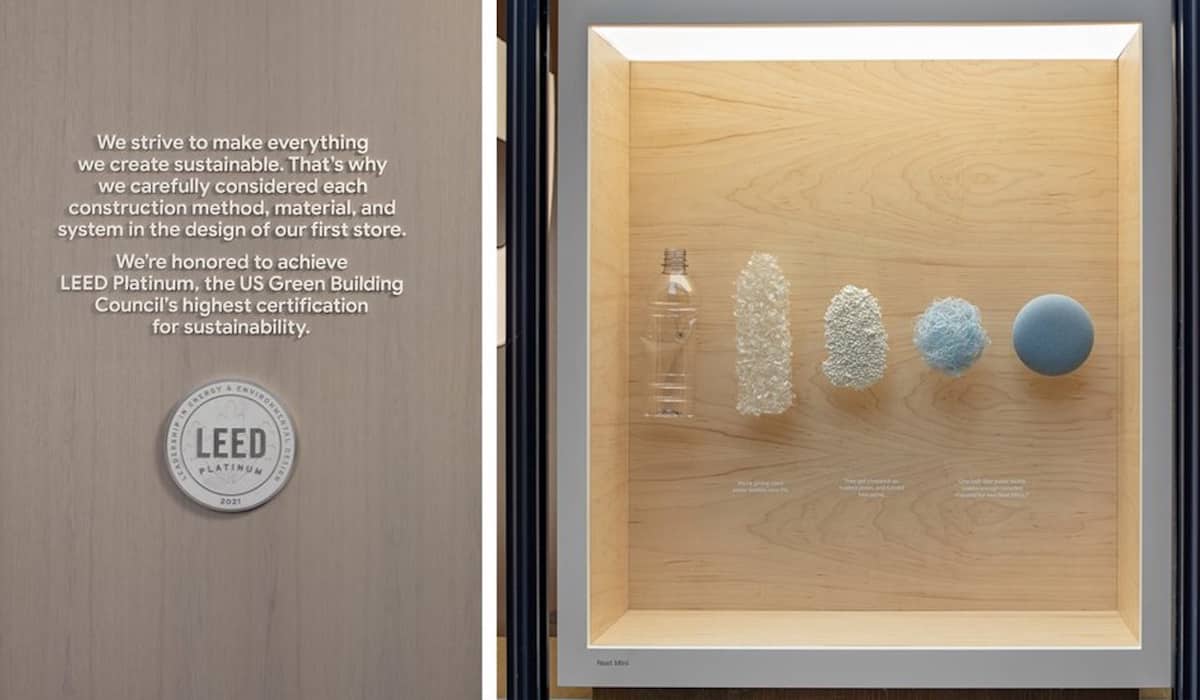 Outro dos destaques desta loja é a forma como representa na perfeição os ideais ambientalistas da Google, tendo cada detalhe pensado para ser o mais sustentável possível. Desde os materiais utilizados na sua construção, à forma como os seus sistemas mecânicos funcionam, a Google não deixou nada ao acaso.