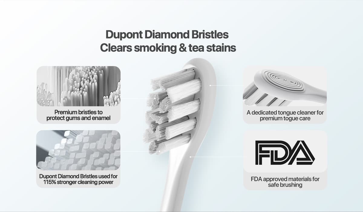 - Filamentos da escova DuPont Diamond, com raspador de língua na parte de trás da escova de dentes