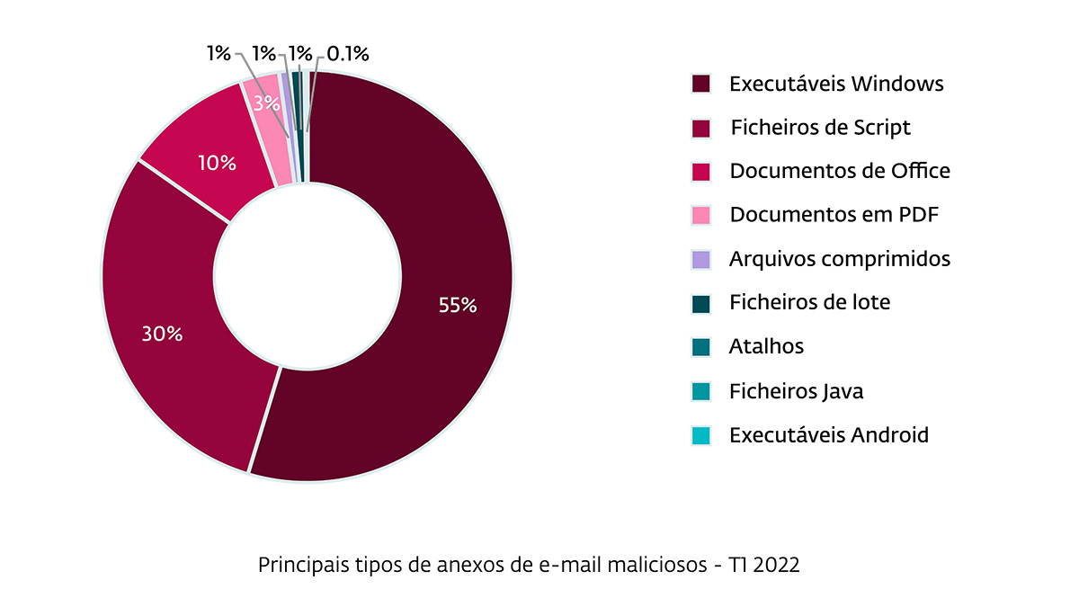 Entre os tipos de anexos maliciosos distribuídos por email no primeiro quadrimestre de 2022, mais de metade foram anexos executáveis Windows (55%). Os ficheiros de Script (30%) e os documentos de Office (10%) também foram populares para cibercriminosos. A prevalência dos ficheiros de Office duplicou neste período devido à atividade do Emotet, mas deverá decrescer no futuro devido ao bloqueio da via de distribuição.