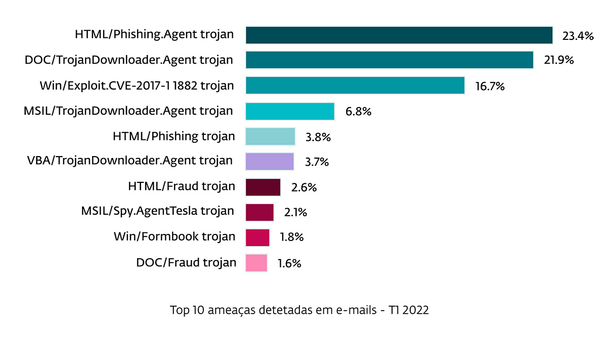 Apesar das atividades de phishing ativas, foram as campanhas de spam de email, com documentos maliciosos da família de trojans bancários Emotet, que são apontadas como a principal razão para o crescimento das ameaças via email. Em março de 2022, a ESET registou um pico de campanhas de email em grande escala do Emotet, detetado como variantes do DOC/TrojanDownloader.Agent. Este aumento foi também registado em Portugal, e corresponde a algumas das 10 principais ameaças detetadas no país no primeiro quadrimestre do ano.
