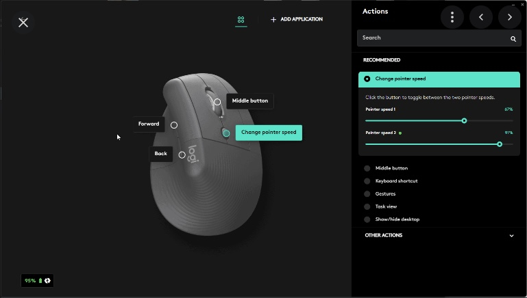 No caso particular do Logitech Lift, isto confere ao rato vertical mais algumas funcionalidades que a sua estrutura básica parece incapaz de oferecer. Todos os 4 botões podem ser reconfigurados tanto em termos gerais como para aplicações particulares, e é aqui que ajustamos os DPI que podemos alterar on-the-fly no botão dedicado.