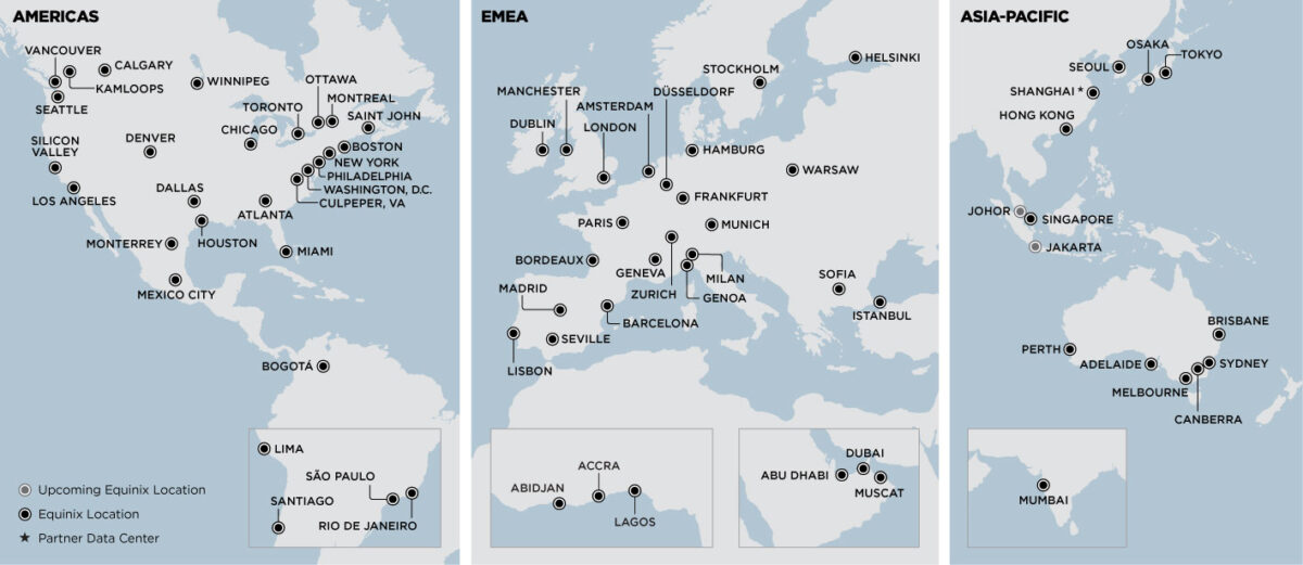 Na região Ásia-Pacífico, a Equinix possui atualmente 51 data centers em 13 áreas metropolitanas (incluindo Austrália, China, Hong Kong, Índia, Japão, Coreia e Singapura), tendo anunciado recentemente a sua expansão para Chennai (Índia) e Jacarta (Indonésia). Depois da inauguração do data center em Johor (Malásia), a Equinix aumentará a sua presença global para mais de 245 data centers, em 71 áreas metropolitanas e 32 países.