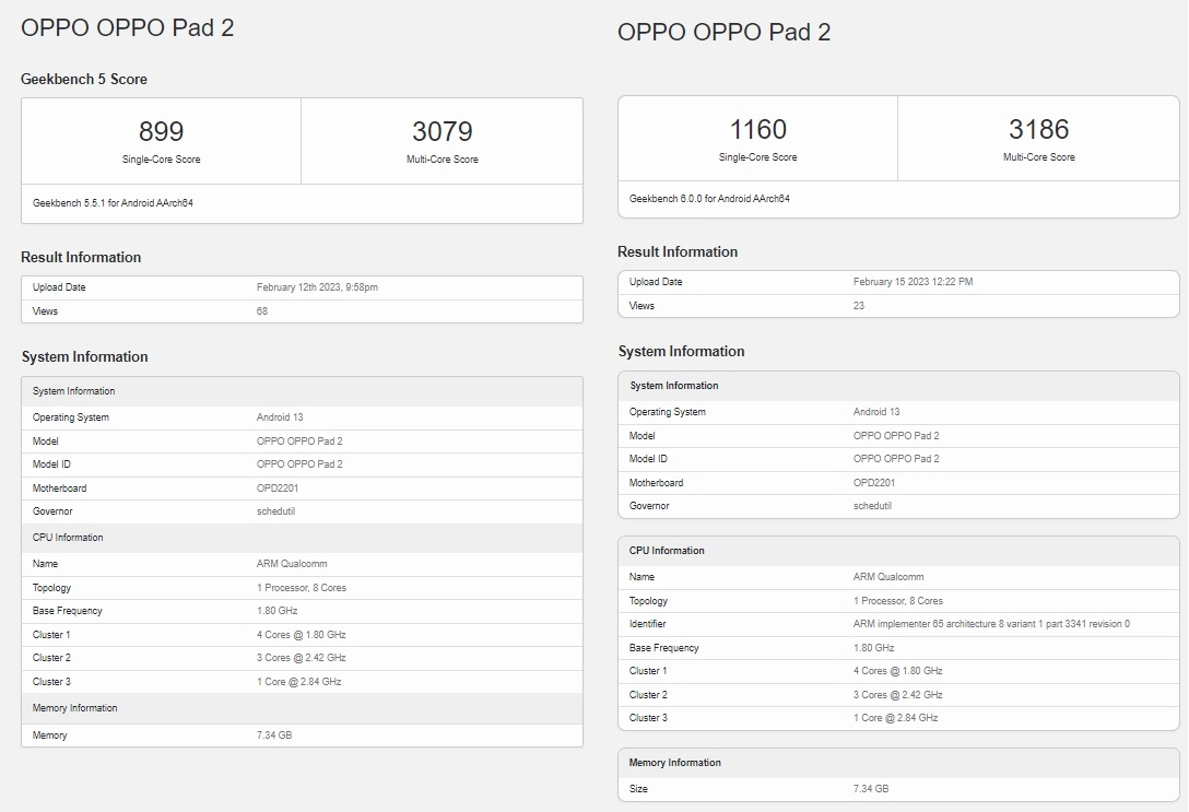 Ainda assim, ao olharmos para os resultados obtidos e detalhes sobre número de núcleos, podemos assumir que o OPPO Pad 2 chegará equipado com o Qualcomm Snapdragon 888 ou o Snapdragon 768. Além disso, foi também confirmado que chegará de fábrica com Android 13.