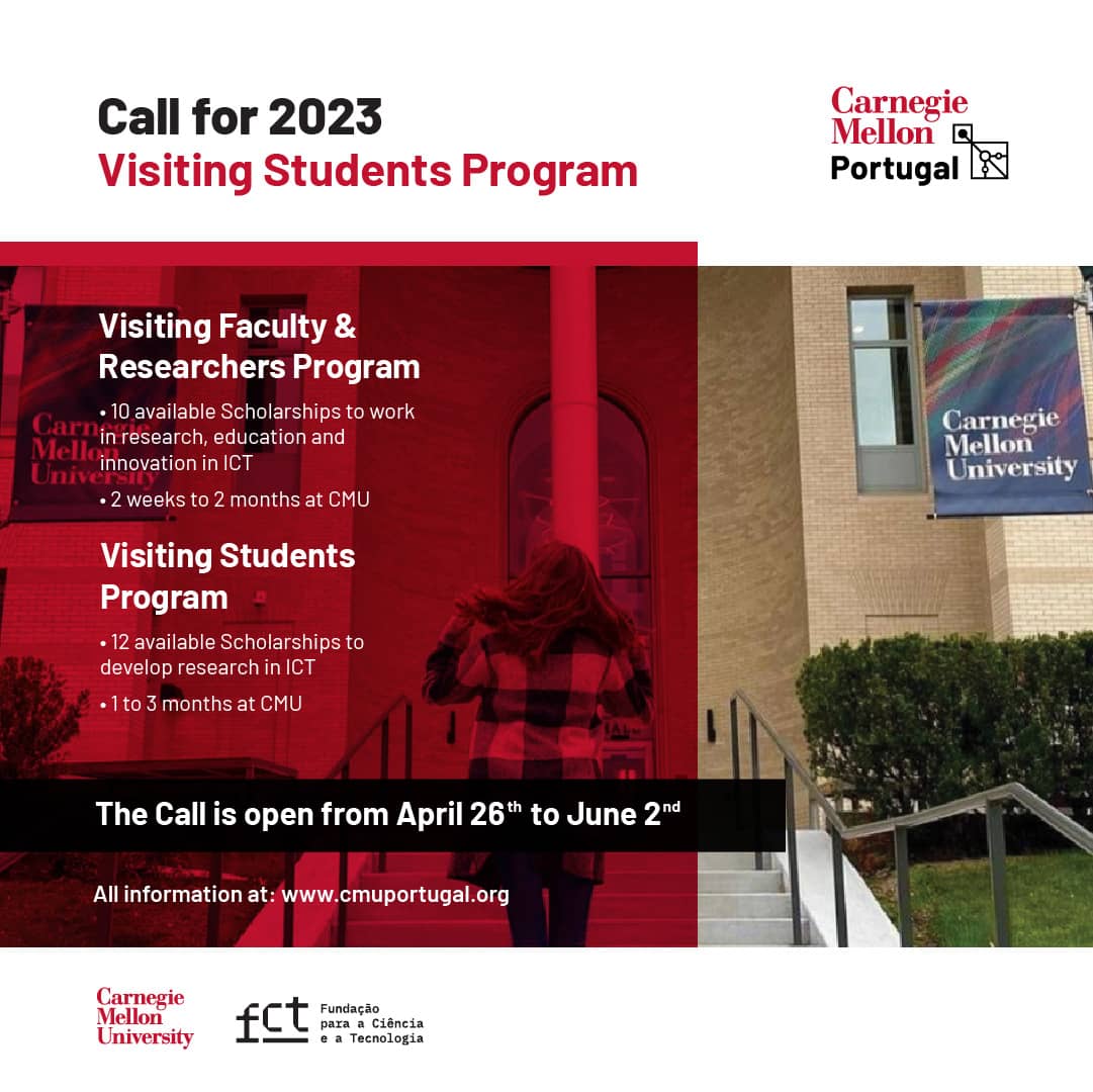 O Programa Carnegie Mellon Portugal (CMU Portugal) está com inscrições abertas até 2 de Junho de 2023 para duas iniciativas de Mobilidade: Visiting Students e Visiting Faculty & Researchers. Financiadas pela Fundação para a Ciência e Tecnologia, o principal objetivo destas iniciativas é proporcionar um período de visita e investigação na Carnegie Mellon University (CMU) em Pittsburgh, permitindo que os candidatos fortaleçam os seus conhecimentos e habilidades como investigadores e abram novas perspetivas de carreira no âmbito das Tecnologias de Informação e Comunicação (TIC).