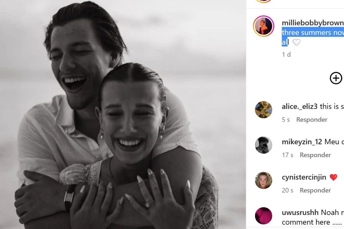 No Instagram, a britânica Millie Bobby Brown publica uma foto com Jake e com o que parece ser um anel de noivado. A publicação já tem mais de 10 milhões de gostos em menos de 24 horas. Nela, Millie diz: “I’ve loved you three summers now, honey, I want ‘em all”. Tudo indica que Eleven está noiva.