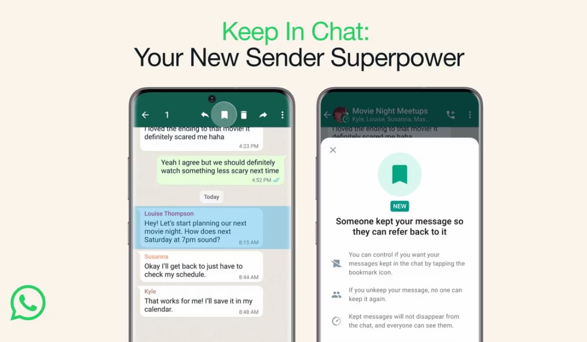 A funcionalidade “Keep in Chat” é uma nova adição às mensagens que desaparecem, que foram introduzidas anteriormente no WhatsApp. Antes da nova funcionalidade, todas as mensagens desapareciam após um tempo predefinido. Agora, os utilizadores terão maior controlo sobre as suas mensagens e poderão decidir quais querem manter e quais devem desaparecer.