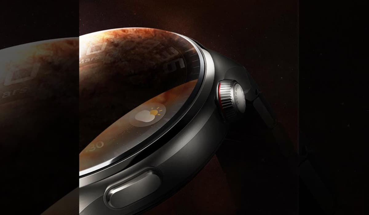 Ao analisar a imagem com maior exposição, é possível ver uma marca escondida que revela a identidade do smartwatch. A inscrição na coroa rotativa diz “Huawei Watch”, o que indica que pertence à linha principal de relógios da marca.