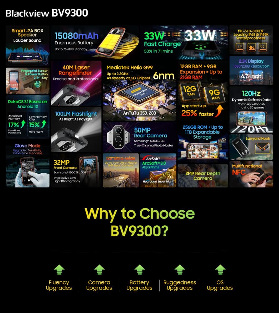 O BV9300 não compromete em termos de desempenho. Equipado com um processador octa-core Helio G99, 21 GB de RAM e 256 GB de memória ROM, este telemóvel garante a fluidez necessária para qualquer tarefa. A sua bateria de 15080mAh assegura uma autonomia invejável, eliminando a ansiedade da bateria durante as suas aventuras.