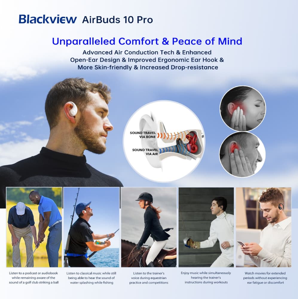 Paralelamente ao lançamento do BV9300, a Blackview apresenta também os seus novos auriculares abertos AirBuds 10 Pro. Com um design estilizado e uma tecnologia de condução de ar avançada, estes auriculares prometem proporcionar uma experiência de som incomparável, seja para atividades de negócios, lazer ou desporto.
