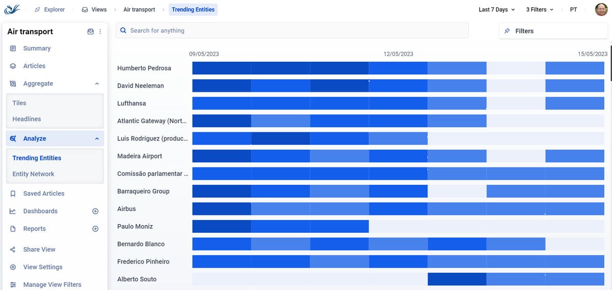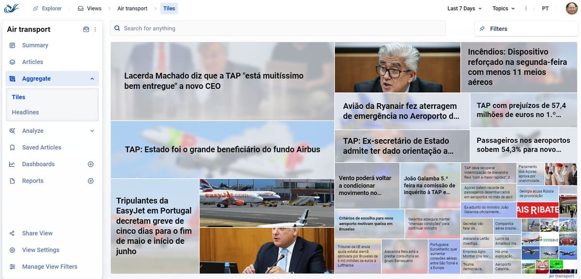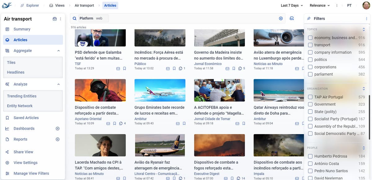 A plataforma organiza automaticamente milhares de artigos em grupos temáticos, proporcionando aos utilizadores uma visão geral de como o conteúdo se relaciona com tópicos específicos, pessoas, empresas, entre outros. Desta forma, os utilizadores podem obter uma compreensão mais aprofundada da sua indústria, mercados e concorrentes.