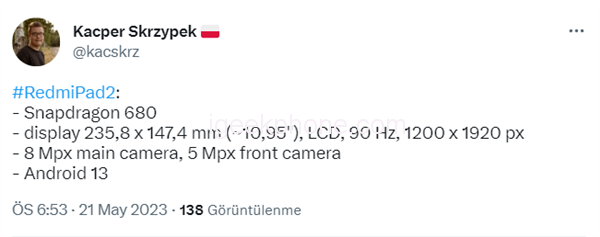 Para surpresa de muitos, o informante internacional Kacper Skrzypek foi o primeiro a dar a conhecer os detalhes de hardware do Redmi Pad 2. Esta nova tablete virá equipada com um processador Snapdragon 680, um ecrã LCD de 10,95”, resolução de 1920×1200, taxa de atualização de 90Hz, uma câmara traseira de 8 milhões de pixeis, uma câmara frontal de 5 milhões de pixeis e será baseada no sistema Android 13. As dimensões desta tablet são de 235.8×147.4mm.