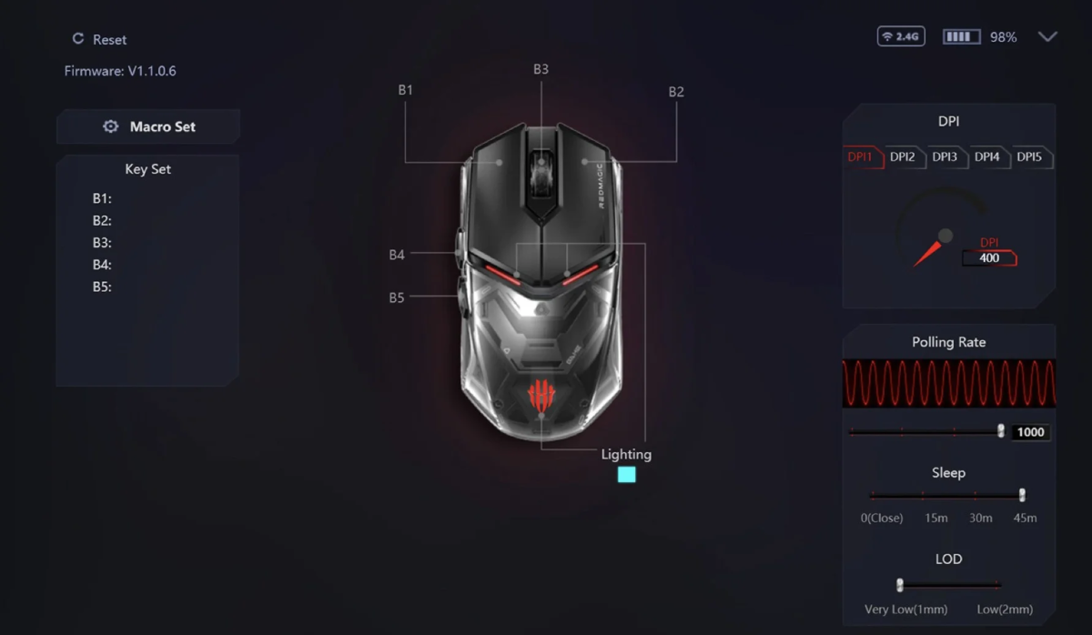 Nesta aplicação podes definir ações específicas para cada botão, bem como ajustar o nível de DPI, a taxa de atualização e o nível de LOD. Também é possível definir o tempo que o rato leva a entrar em modo de repouso. Convém realçar que existem combinações de teclas que te permitem alterar algumas destas definições diretamente no rato.