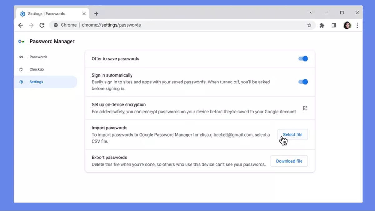 A Google também vai permitir que importes palavras-passe de gestores de terceiros para o Chrome no teu computador. Segundo a página de ajuda da Google, deves primeiro converter as tuas credenciais num ficheiro .csv antes de carregar qualquer coisa no navegador.