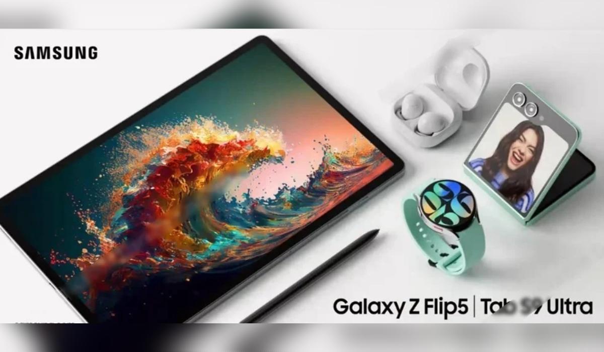 Uma das imagens promocionais mostra o Galaxy Z Flip 5 com o seu novo ecrã Cover Screen de 3,4”, ao lado do tablet Galaxy Tab S9 Ultra com as suas 14,6” polegadas, acompanhados pelo Galaxy Watch 6 e os Galaxy Buds 3. A grande novidade da Samsung este ano é precisamente o ecrã Cover Screen do Galaxy Z Flip 5, que surge maior em relação ao seu antecessor de 1,9”.