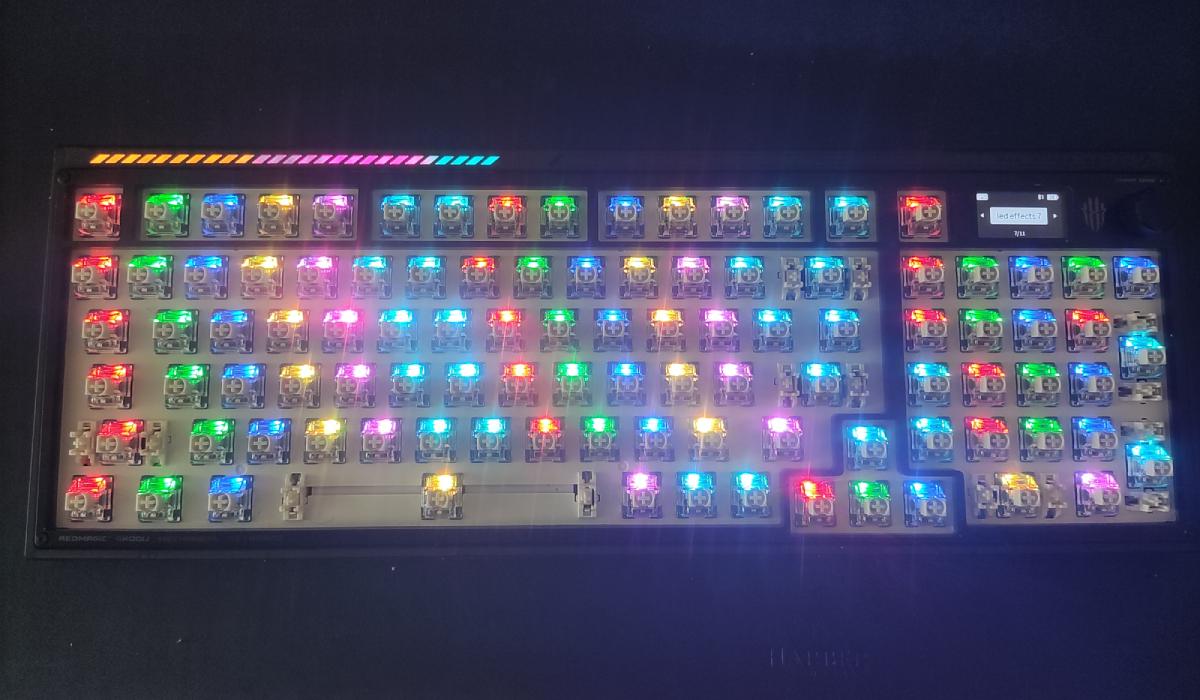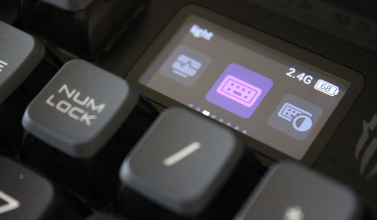 Tal como a maioria dos teclados mecânicos, também oda RedMagic coloca à disposição um grande nível de personalização. No que respeita às suas características mais incomuns, temos de destacar o ecrã LCD, que pode ser controlado com a pequena roda. Através deste ecrã vais poder controlar várias opções no teu teclado, começando pelos efeitos disponíveis para as luzes LED, assim como níveis de performance do computador e imagem personalizada para o screensaver do ecrã.