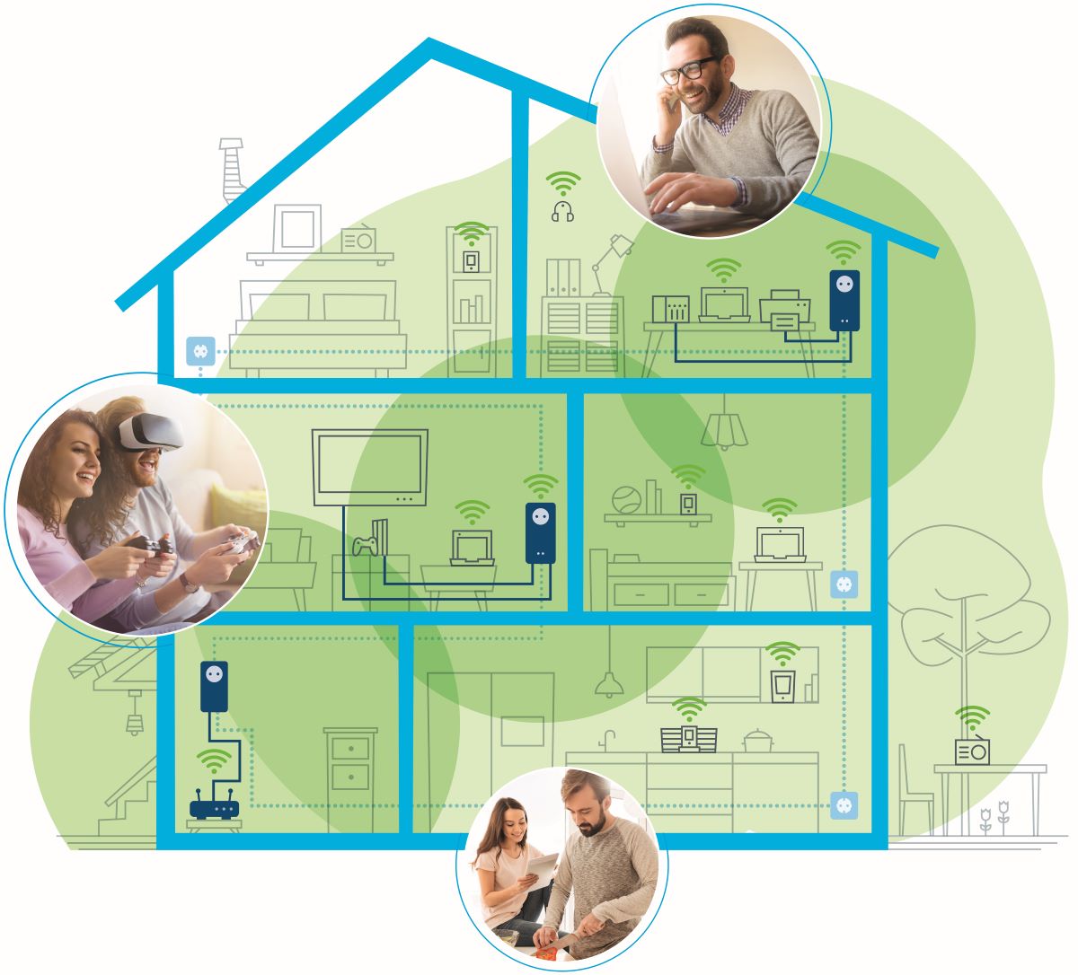 Com os adaptadores Wi-Fi da devolo, qualquer tomada elétrica pode transformar-se num ponto de acesso Wi-Fi ultrarrápido. A tecnologia de rede mesh oferece uma cobertura Wi-Fi extraordinariamente estável, ao garantir que todos os dispositivos estejam ligados ao melhor ponto de acesso e banda de frequência.