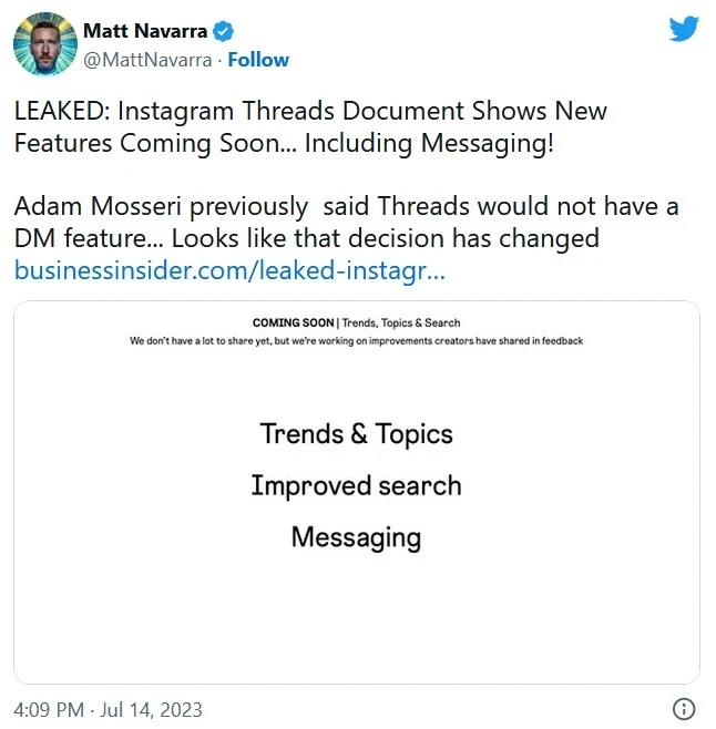 Mas agora, parece que o Threads pode oferecer DMs mais cedo do que o esperado. O Business Insider (via BGR) obteve uma fuga de informação de um memorando interno da Instagram, que indica que as DMs estarão “a chegar brevemente” ao Threads, com algumas outras funcionalidades. Apesar do relatório estar atrás de um paywall, o analista de redes sociais Matt Navarra partilhou no Twitter (ironicamente) que o memorando menciona novas capacidades que estão a caminho do Threads.