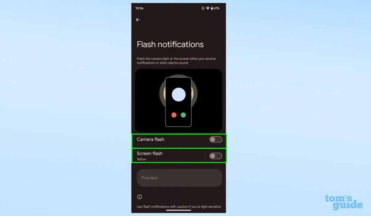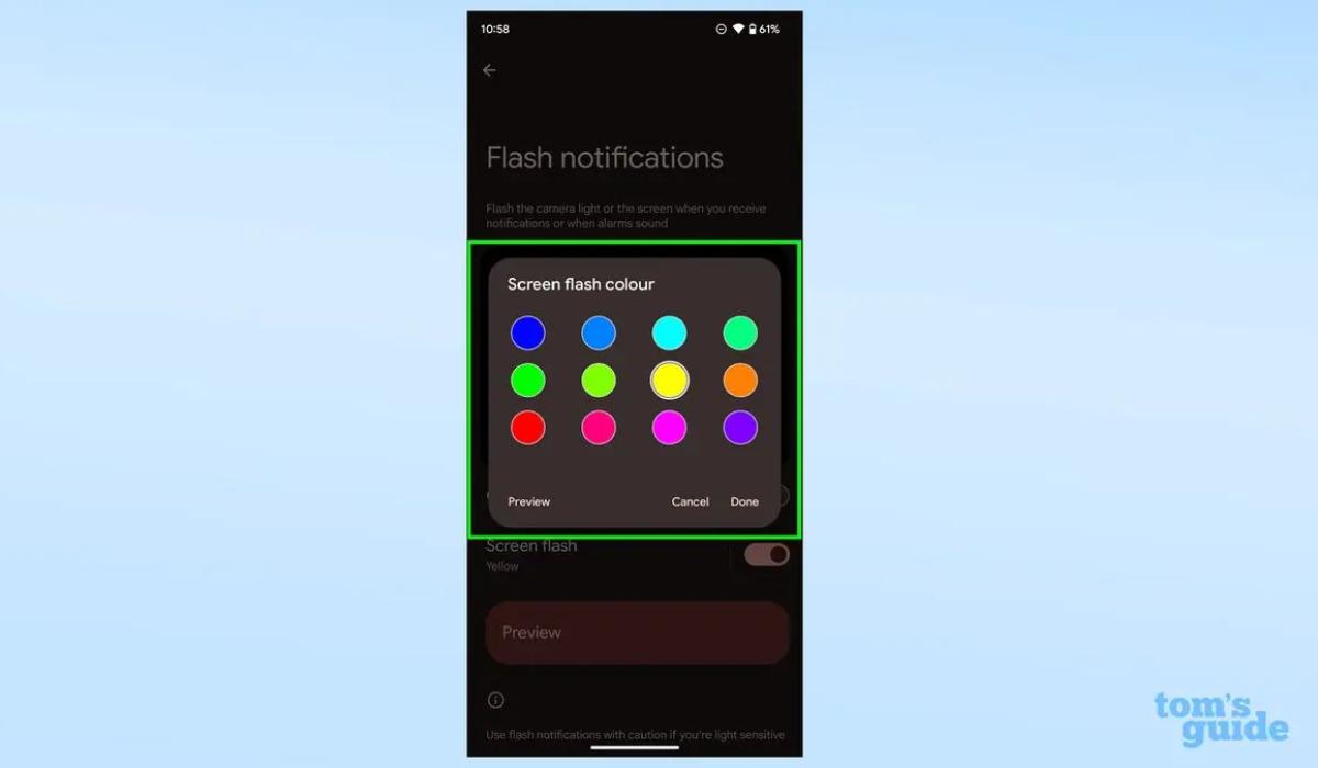 - Flash do ecrã: Se preferires algo mais visível, podes optar pelo flash do ecrã. Quando ativado, o ecrã pisca duas vezes com um tom amarelo. Além disso, podes escolher entre 12 cores diferentes para personalizar ainda mais a tua experiência.